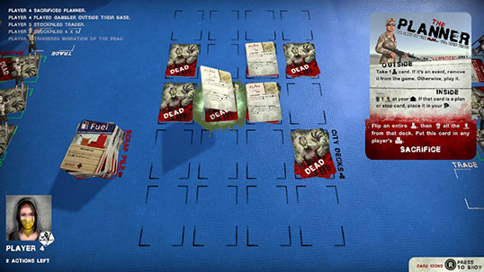 Another game mode is survival. In survival you have 21 turns to get 1 of everything. So one vehicle, fuel, food and a survivor. However, there is another player in the game and he might try to snag an item from your stockpile and if you don’t have the required materials by the end of the last turn you lose. Difficulty scales by how many weeks you survive and how many cards spawn in the middle every turn.
