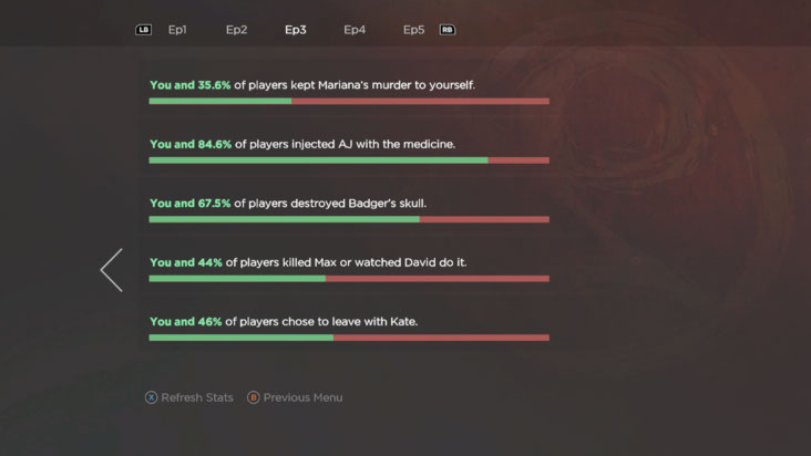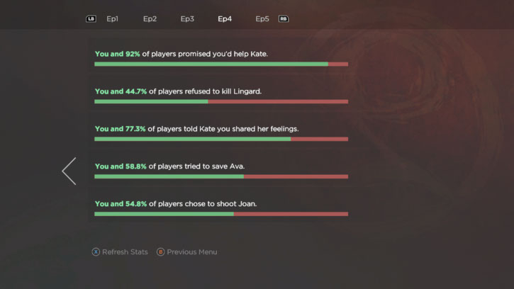 At the beginning of the fourth episode of this instalment you are brought into a flashback Javi has. He is with his brother at a baseball batting range. All this was about was showing how Javi became the sports player he is now. It also shows how depressed his brother was. You escape from being imprisoned and meet Kate and you try to get ready for a fight. You end up getting caught by Ava, but she doesn’t mind and helps you out. You also have a moment in the episode where you have the choice to help kill Lingard by drugging him or not. There’s also a special moment between you and Kate before getting to the finale and you have the choice of saying to her that you share the same feelings with her. However, you don’t need to say you share the same feelings. Then at the end you have the choice between Ava or Tripp to save since Joan told you to pick one of them. Whoever you pick, is the one that dies. Talk about reverse psychology. Your also given a deal to run away with your family and whoever doesn’t die or to shoot Joan. Kate comes in and blows a hole into Richmond. Big important episode but very slow.
